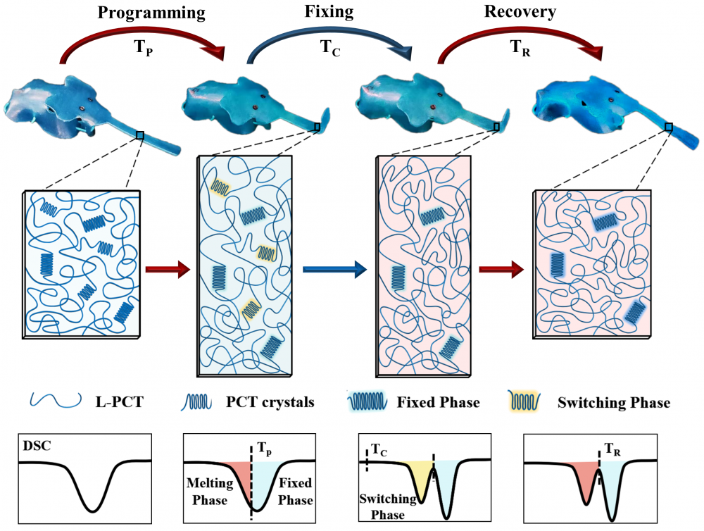 该课题组基于生物性能优异的含环醚侧基的线性聚己内酯Linear-poly(CL-co-TOSUO)(L-PCT),提出了一种新的基于结晶性能的物理工艺,以赋予线性聚合物良好的形状记忆性能。研究工作将形状编程温度设置为处于高分子的熔限范围内,通过部分熔融/重结晶的方式,将晶体分离为具有不同熔融温度的两部分:将重结晶过程中形成的低熔点晶体指定为体系的可逆相、确保临时形状的固定及激活;高熔点晶体在形状记忆循环中保持结晶,以“记忆”提供回复动力的初始永久网络。再次升温回复时,可逆相的小晶体会先熔化,并在固定相晶体的牵引下完成材料的形状回复;而固定相的晶体可以在更高的温度下熔融,以实现材料的回收利用或再加工。以此,由L-PCT的结晶/熔融转变即可赋予其出色的形状记忆效应。研究工作深入探索了编程温度以及预拉伸处理等物理性调节方法对体系中充当可逆相与固定相晶体的影响,不涉及材料的合成过程,在实际应用中灵活、简单,并展示了L-PCT实现复杂智能形变的功能。