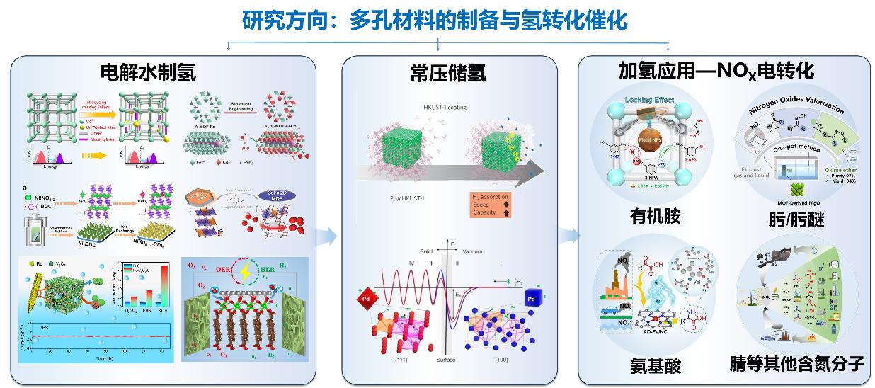 课题组长期从事清洁能源储存与利用方面新材料的研发,包括多孔配位材料的制备及其在制氢、储氢、氢能利用方面研究,开辟了氮氧化物(NOx)电转化合成氨基酸等含氮有机小分子的方向。属于物理、化学、材料和能源交叉学科,具体为多孔配位材料的制备与表征,及其在气体吸附、催化等方面的物理和化学性质。