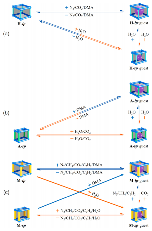 和H和A相比,M的–CH3提供的适中氢键作用,有效降低了两相之间的能量差。同时,体积更大的–CH3有效提高了结构转变的能垒,使得各个孔结构都可以在脱客体后稳定存在(图3)。