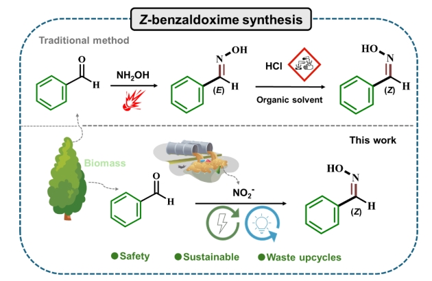 肟类化合物的立体构型直接决定了其衍生药物分子与靶点的结合模式及生物活性,在药物合成路径设计与活性调控中起着关键作用。以Z-苯甲醛肟的合成为例,传统合成路径通常以苯甲醛与盐酸羟胺(NH₂OH·HCl)为起始原料,由于盐酸羟胺存在化学稳定性差、腐蚀性强的固有缺陷,其储存与运输过程面临安全风险,极大提高了肟合成的生产成本;对于E→Z构型转化步骤,传统方法依赖浓盐酸、乙醚等苛刻反应介质,对生态环境与操作人员健康构成双重威胁(图1)。因此,发展专一构型的肟类合成新方法,对推动构型明确的药物研发及精细化学品绿色合成具有重要意义。