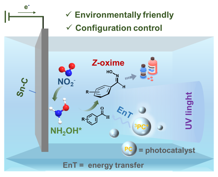 性奴李光琴教授课题组长期从事清洁能源储存与利用方面新材料的研发,开辟了氮氧化物(NOx)电转化合成氨基酸、肟等含氮有机小分子的方向。课题组首次实现了氮氧化物电催化合成氨基酸(Angew. Chem. Int. Ed. 2023, e202304007),提出了多种策略从氮氧化物电催化高效合成肟类化合物(Angew. Chem. Int. Ed. 2025, 64,e202515660;Angew. Chem. Int. Ed. 2025, 64, e202419550;Angew. Chem. Int. Ed. 2024, 63, e202405553;Angew. Chem. Int. Ed. 2023, 62, e202312239)。目前,电催化产物基本上都是热力学稳定的E-构型肟,开发具有立体特异性的肟类合成新策略,不仅能够突破传统工艺的安全与环境瓶颈,更为立体选择性有机合成领域提供了新的技术范式。近日,该课题组报道了一种光电协同催化新策略,首次实现以亚硝酸盐(NO₂⁻)和醛为原料直接合成Z-构型肟。该策略通过Sn纳米晶锚定的多级孔碳基复合材料(Sn-C)作为电催化剂,将亚硝酸盐高效还原为活性中间体*NH₂OH,并在反应体系中与醛发生原位偶联反应生成E-肟;同时,利用二苯甲酮光催化剂的三重态能量转移机制,驱动E-肟向Z-肟的构型异构化,使产物中Z-肟的比例比单一电催化过程提升13倍。对照实验证明,光、电二者缺一不可,Sn-C相比较于其他对比材料有更优秀的催化性能。该策略适用于多种取代醛及位阻较大的酮肟合成,体现出良好的普适性。该研究工作摒弃了传统肟类合成方法中对不稳定羟胺试剂和腐蚀性酸介质的依赖,为立体选择性肟类化合物的可控合成提供了绿色高效的新路径,也为废弃氮氧化物的资源化利用开辟了创新研究。