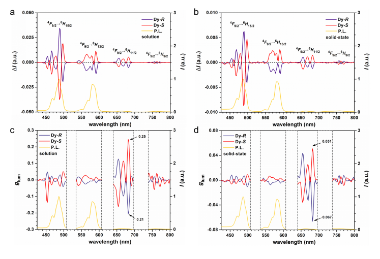 3. Dy-S/R室温下的圆偏振发光(CPL)性能,包括溶液态(CH2Cl2ab)和固态(cd)下的 ΔIac)与 glum值(bd)。