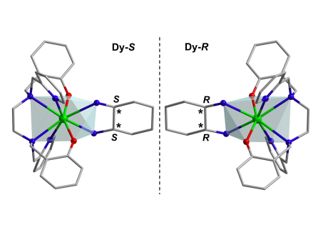 近期,该团队基于高性能 SMM 构筑单元 [Dy(bbpen)]⁺ 与手性环己二胺配体首次合成了纯手性配合物对映体[Dy(bbpen)(S,S/R,R-chxn)](BPh4) (Dy-S/R)(图2)。